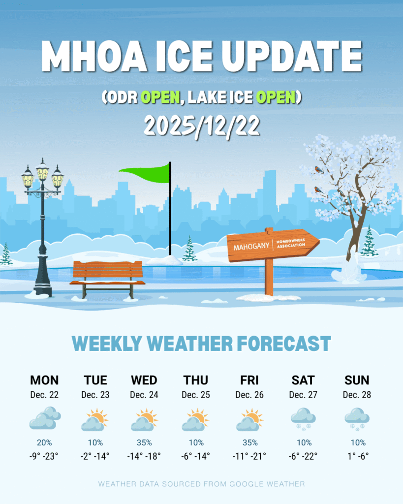 Please note that our team will be doing maintenance throughout the day. For the latest status updates and the full schedule for hockey/leisure times, please visit our website at www.mahoganyhoa.com and follow our Instagram and Facebook. Thank you for your cooperation in keeping our community safe!