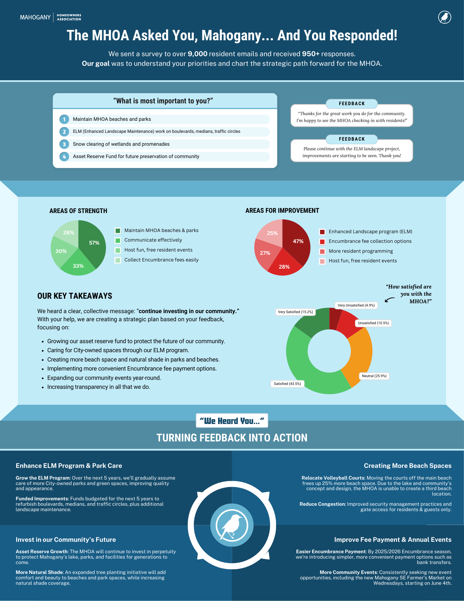 Welcome to our dedicated page outlining the top highlights and next steps from the recent MHOA Community Survey that was sent out in the Fall of 2024. Your feedback helps us continuously improve your community.